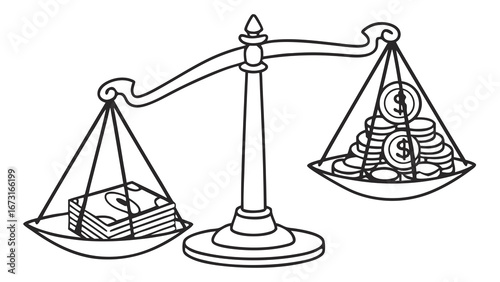 money, coin, banknote, currency, finance, wealth, value, comparison, inequality, economic, investment, cost, savings, debt, income, expense, payment, exchange, market, business, commerce, illustration, drawing, black-and-white, line art, conceptual, metaphor, budget, weighing, measurement, justice, prosperity, economy, capital, asset, graphic, symbol, decision, risk, profit, loss
