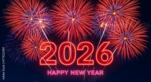fireworks, new year, 2026, celebration, holiday, festive, party, event, night, sky, bright, explosion, colourful, red, purple, glowing, neon, text, happy new year, greeting, banner, background, vibrant, sparkle, congratulation