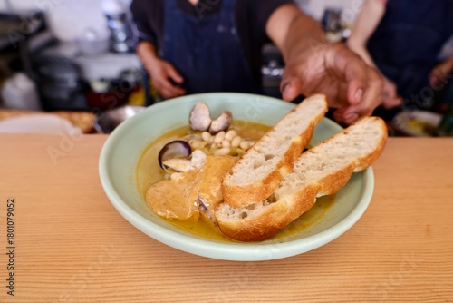 fish and shellfish stew with crostini and chef hand
