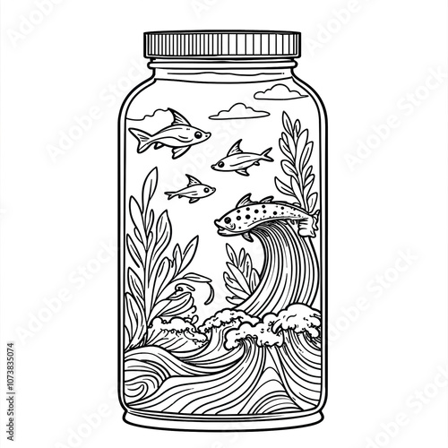 fish, jar, line art, vector, illustration, clip art, graphic, black-and-white, outline, hand-drawn, whimsy, simple, honed, touch, inside, swimming, water, wave, plant, nature, environment, marine life, underwater, aquarium, ocean, sea, river, lake, duck pond, fishbowl, glasses, transparent, container, closed, open, top, bottom, side, front, back, white background, black background, colored background
