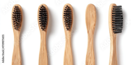 bamboo, toothbrush, natural, sustainable, environmentally friendly, oral, hygiene, dark, bristle, wooden, handle, clean, healthy, care, teeth, cleaning, product, eco, organic, alternative, modern, minimalist, design, beauty, essential, household, simple, 5, aligned, isolated, white, background, grey, charcoal