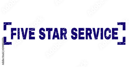 FIVE STAR SERVICE text seal print with distress texture. Text label is placed between corners. Blue vector rubber print of FIVE STAR SERVICE with scratched texture.