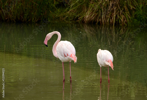 flamingo, 2, standing, feeding, bird, big, large, wading, exotic, tropics, tropical, nature, habitat, lake, duck pond, swamp, wetland