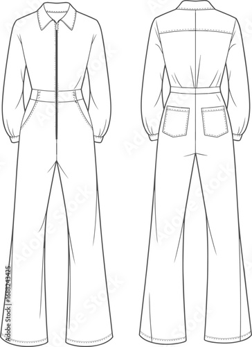jumpsuit, fashion, clothing, design, vector, vignetting, apparel, garment, outfit, sleeve, collar, zip, pant, pocket, flat, technical drawing, digital illustration, front view, backview