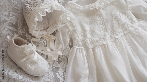 Flat lay of a baby's christening outfit, focusing on a delicate white gown, arranged with a bonnet and soft booties on a lace fabric.