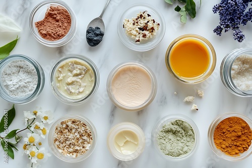 Flat Lay of Homemade Facial Masks in Glass Bowls on Rustic Surface