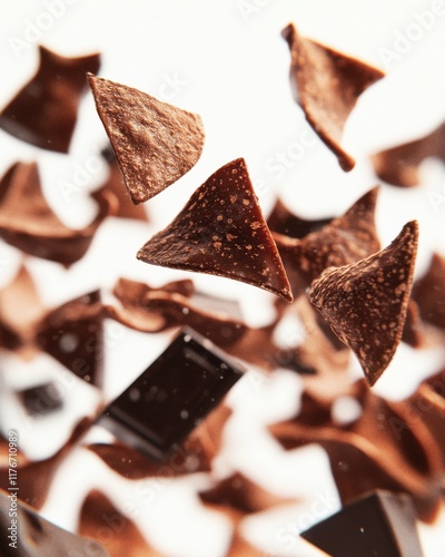 Floating dark chocolate pieces creating a dynamic sweet scene.