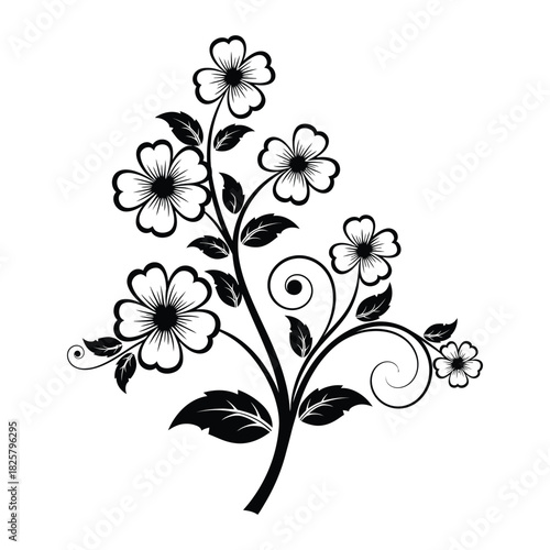 Floral branch with blossoms black and white silhouette