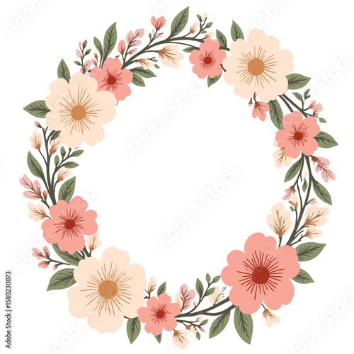Floral wreath with pink and peach flowers on white background