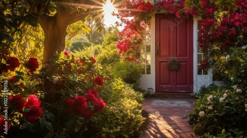 flower, red, door, open, illustration, garden, sunlight, vibrant, bloom, inviting, atmosphere, way, colourful, warm, beautiful, nature, entrance, exterior, landscape, scene, view, bright, cheerful, welcoming, floral, picturesque, radiant, serene, peaceful, lush