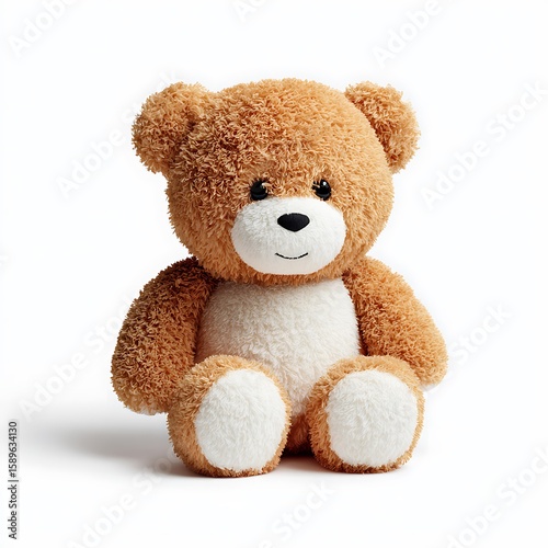 teddy bear, plush toy, stuffed animal, brown, tan, beige, white, fluffy, soft, furry, cute, adorable, toy, isolated, white background, studio shot, front view, sitting, friendly, innocent, cuddly, childhood, gift, present, play, comfort, sweet, simple, object, no people, blank, empty space, copy space, marketing, advertising