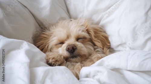 dog, puppy, sleep, sleeping, bed, cosy, cute, adorable, fluffy, soft, comfort, rest, peaceful, calm, relaxed, happy, sweet, gentle, animal, pet, canino, furry, paw, eye, closed, white, blanket, sheet, duvet, home, house, room, bedchamber, nap, dreaming, tranquil, serenity, warmth, cuddly, friends, love, loyal, playful, small, young, companion, domestic, mammal