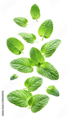 flying fresh mint leaves isolated on transparent white background, clipping path