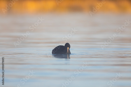 Focha común (fulica atra) nadando en un lago al amanecer