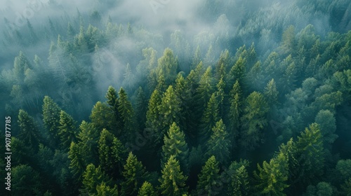 Foggy morning green pine forest scenery from drone aerial view nature background