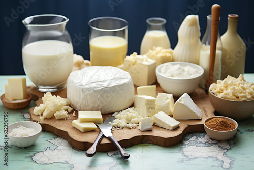 Food and culture concept. Various dairy products such as milk, cheese, cheese with mold, cream, butter, curd and others placed on European visualized map background. Generative AI