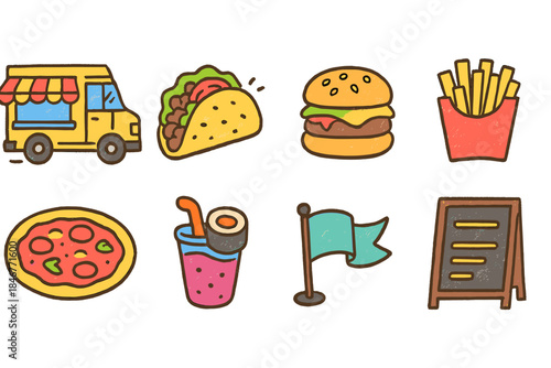food, drink, fast, snack, beverage, flag, menu, board, outline, icon, set, burger, pizza, taco, fries, truck, soda, collection, symbol, doodle, eat, eatery, delicious, graphic, fun