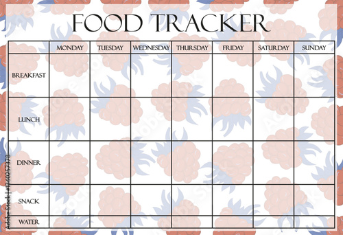 food, tracker, raspberry, meal, breakfast, lunch, dinner, snack, water, fruit, red, blue, plan, log, layout, grid, weekly, nourishment, background, routine, health, sweet, structure, printable, journal
