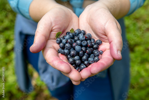 Forest blueberries in the hands of a girl