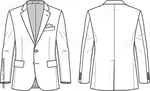Formal men’s blazer vector illustration, front and back view, stylish suit jacket fashion template, clothing design sketch, garment mockup