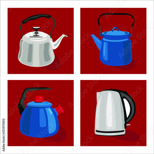 Four different shapes and sizes of teapots in red, blue and metallic colors. Vector hand drawing.
