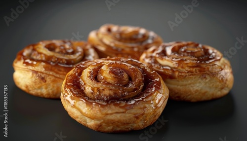 Four golden brown cinnamon rolls with a sweet glaze, arranged in a semi-circle on a black surface.