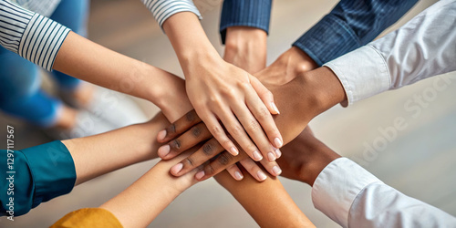 Four hands united in collaboration business meeting teamwork environment close-up perspective