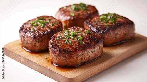 Four perfectly grilled beef patties with herbs on a wooden cutting board, close-up shot in a bright kitchen setting, and appetizing and juicy texture.