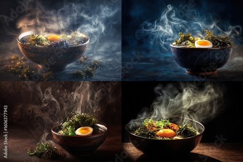 food, bowl, steam, egg, greener, garnish, moody, light, dark, warm, culinary, cookery, delicious, fresh, texture, favor, appetising, ready, serve, eat, meal, lunch, dinner, breakfast, dish, hot, comfort, inviting, vibrant, close, perspective, angle, detail, artistic, aesthetic, composition, studio, prepared, nourishing, healthy, natural, organic, soup, broth, vegetable, seaweed, side, closeup
