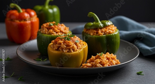 Four stuffed peppers with rice on a plate