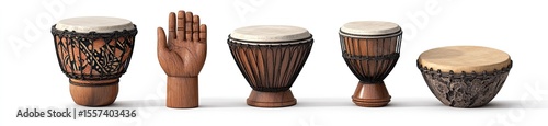Four traditional hand drums, a hand, isolated on white