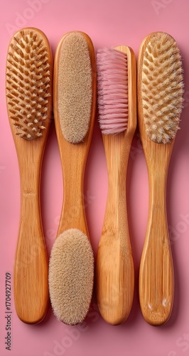 Four wooden-handled body brushes on a pink background