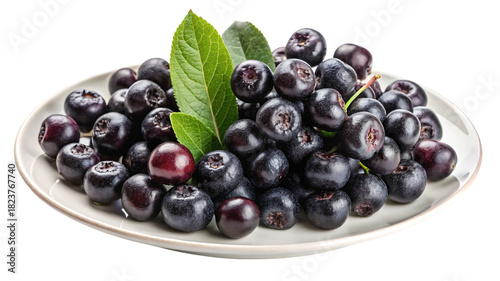 Fresh aronia berries with green leaves on white plate, healthy