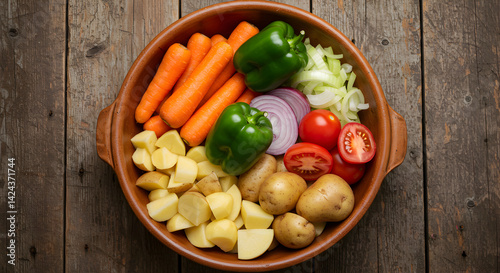 vegetable, carrot, potato, tomatoes, pepper, onion, leek, salad, healthy, fresh, bowl, wooden, table, ingredient, food, diet, nourishment, cooking, cookery, raw, vibrant, colourful, organic, natural, vitamin, mineral, antioxidant, vegetarian, vegan, fiber, tasty, delicious, meal, harvest, farm, garden, produce, source, earthenware, wholesome, earth