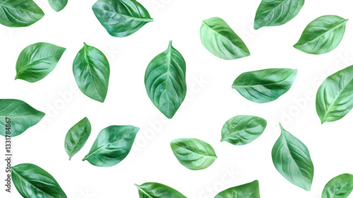 Fresh basil leaves scattered on a white background ready for culinary use or decoration in a kitchen setting