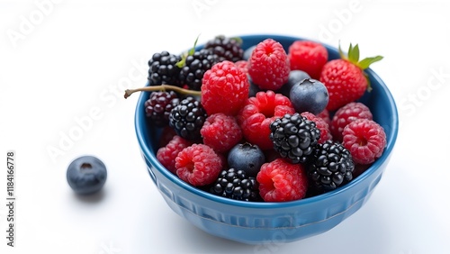 Fresh Berries in Blue Bowl, Vibrant Raspberries, Blackberries, Blueberries - Summer Fruit Still Life