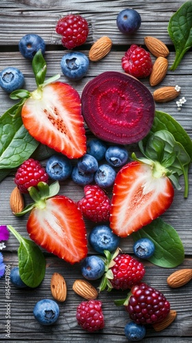 fresh, berry, nut, mix, wooden, background, strawberry, blueberry, raspberry, almond, spinach, healthy, vibrant, colourful, vegetarian, snack, natural, food, nourishment, diet, fitness, ingredient, raw, organic, antioxidant, variety, vegan, tabletop, texture, edible, basil, beetroot, flower, lifestyle, well-being, culinary, epicure, freshness, assortment