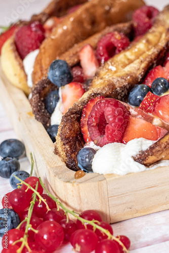 Fresh brown sweet hotdogs with cream cheese and fresh berries - blueberries, strawberries, raspberries and currants.
