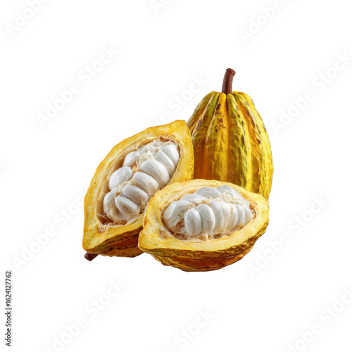 Fresh Cacao Pods Open and Whole, Showing Seeds and Pulp