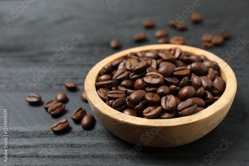 Fresh coffee beans in a wooden bowl on a wooden background