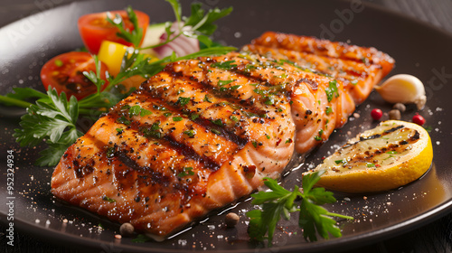 fillet, salmon, steak, food, fish, dinner, meal, grill, grilled, healthy, lunch, background, seafood, epicure, bar-b-q, prepared, fried, cookery, roasted, cooked, lemon, omega, nourishment, filet, eating, vegetable, roast, meat, delicious, pepper, cooking, diet, black, fresh, plate, baked, red, dish, tomatoes, rosemary, green, closeup, portion, artificial intelligence