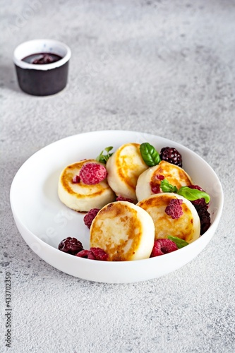 Fresh cottage cheese or ricotta pancakes (syrniki,fritters) on a white plate with fresh berries and jam. Delicious healthy cottage cheese breakfast. Ukrainian, Russian cuisine sweet food