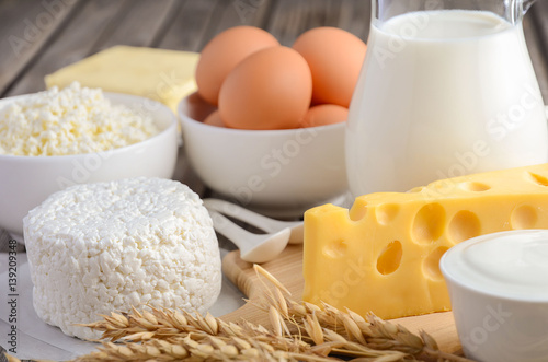 Fresh dairy products. Milk, cheese, brie, Camembert, butter, yogurt, cottage cheese and eggs on wooden table.