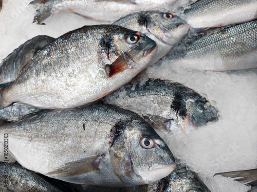 Fresh dorado fish on ice at the market display for sale. Seafood in grocery store. Healthy food concept. Raw fish food.