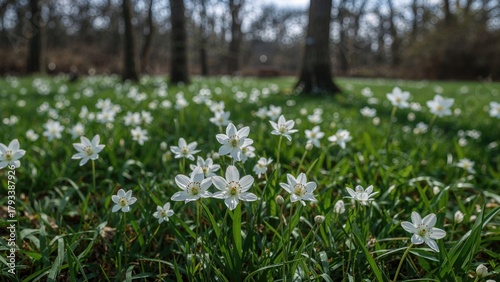 Fresh flowers blooming on green grass in a forested area during springtime. Nature, floral, and outdoor scene.