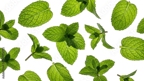 Fresh green mint leaves scattered isolated on transparent background