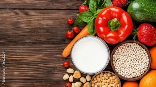 vegetable, fruit, red pepper, cucumber, strawberry, carrot, dairy, yogurt, nut, grain, chickpea, healthy, organic, kitchen, cooking, fresh produce, ingredient, nourishment, diet, vegetarian, colourful, vibrant, wholesome