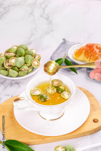 Fresh Kumquat Herbal Tea with Honey and Sliced Citrus Fruit in White Teacup on Marble Surface