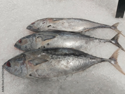 Fresh mackarel tuna on ice in supermarket. Whole fish for sale in seafood department. Close up; selective focus. Cloudy eyes from the frozen ice bed.