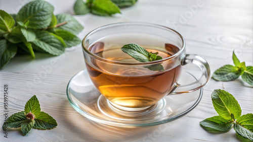 Fresh mint tea served in glass cup with mint leaves on white wooden background